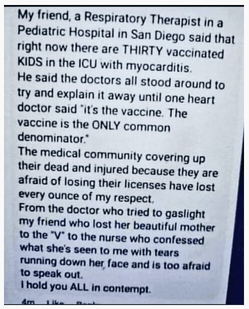 У меня лично был пациент, умерший через 3 месяца после вакцинации от перикардита, что как мы знаем, является известным побочным эффектом. Диагноз поставлен через 30 дней после “вакцины” от Covid-19, VAERS о нём не упоминает. Большинство медсестер, менеджеров медсестер и некоторые врачи даже не знают, что такое VAERS. Я разговаривала с нашим главным врачом, менеджерами и другими медсестрами о том, почему мы не отчитываемся в VAERS, и наиболее частым ответом было: “Что такое VAERS?”