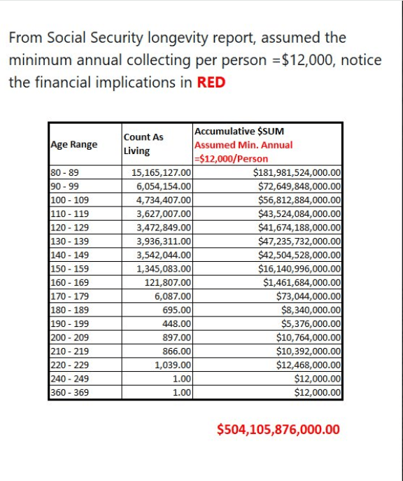 В США насчитывается 394 миллиона получателей социального пособия, несмотря на то, что в стране проживает всего 334 миллиона граждан, разница составляет более 60 миллионов. Согласно базе данных социального обеспечения, в США проживает почти 3 000 человек в возрасте старше 200 лет.