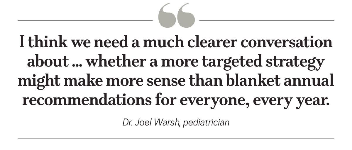 Врач из Калифорнии Уорш сказал, что защита от столбняка и коклюша важна, «но справедливо задаться вопросом, является ли четыре дозы DTaP в первые два года единственным разумным подходом, может ли интервальное введение или уменьшение общего числа прививок в условиях низкого риска сохранить защиту, одновременно снижая нагрузку, и насколько быстро иммунитет ослабевает в разных возрастных группах».