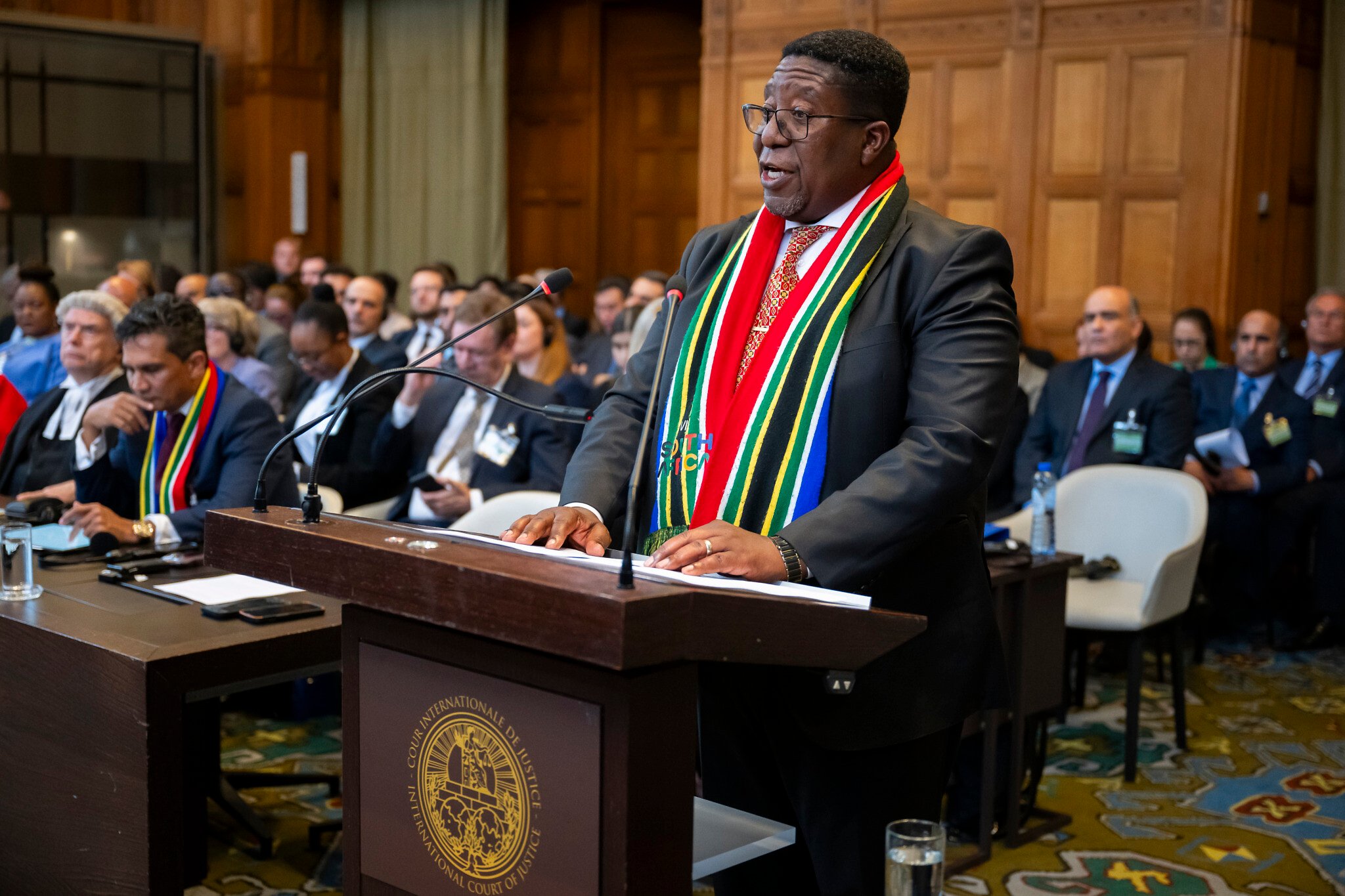 Посол ЮАР в Нидерландах Вусимузи Мадонсела выступает в Международном суде с устной речью, прося суд приказать Израилю прекратить военную кампанию против ХАМАС, 16 мая 2024 г. (Международный суд)