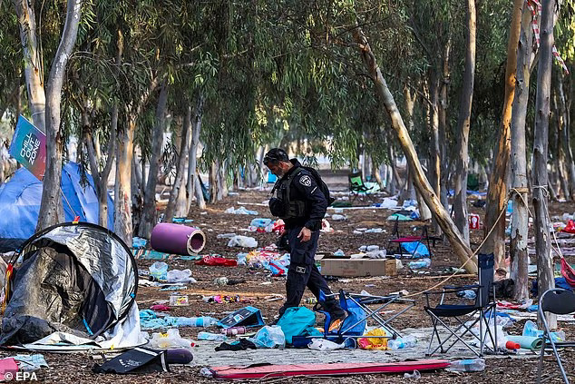 Израильский офицер идёт по территории фестиваля «Нова» в Рейме, Израиль, 17 октября 2023 года.