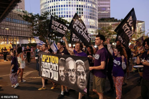 Демонстранты держат баннер с изображениями премьер-министра Израиля Биньямина Нетаньяху, министра финансов Бецалеля Смотрича и министра национальной безопасности Итамара Бен-Гвира во время акции протеста с требованием немедленного освобождения заложников, удерживаемых в секторе Газа, в Тель-Авиве, 5 июля 2025 года.