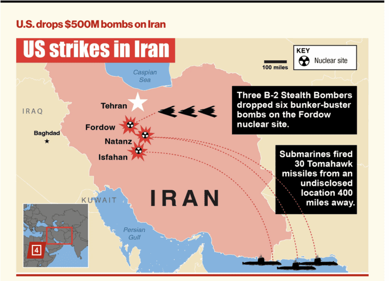 Соединенные Штаты присоединились к израильско-иранскому конфликту 21 и 22 июня, примерно через неделю после первых ударов Израиля. Трамп приказал провести дальний авиаудар, в ходе которого бомбардировщики-невидимки сбросили противобункерные бомбы на три крупных иранских ядерных объекта, зарытых в сотни футов под землей.